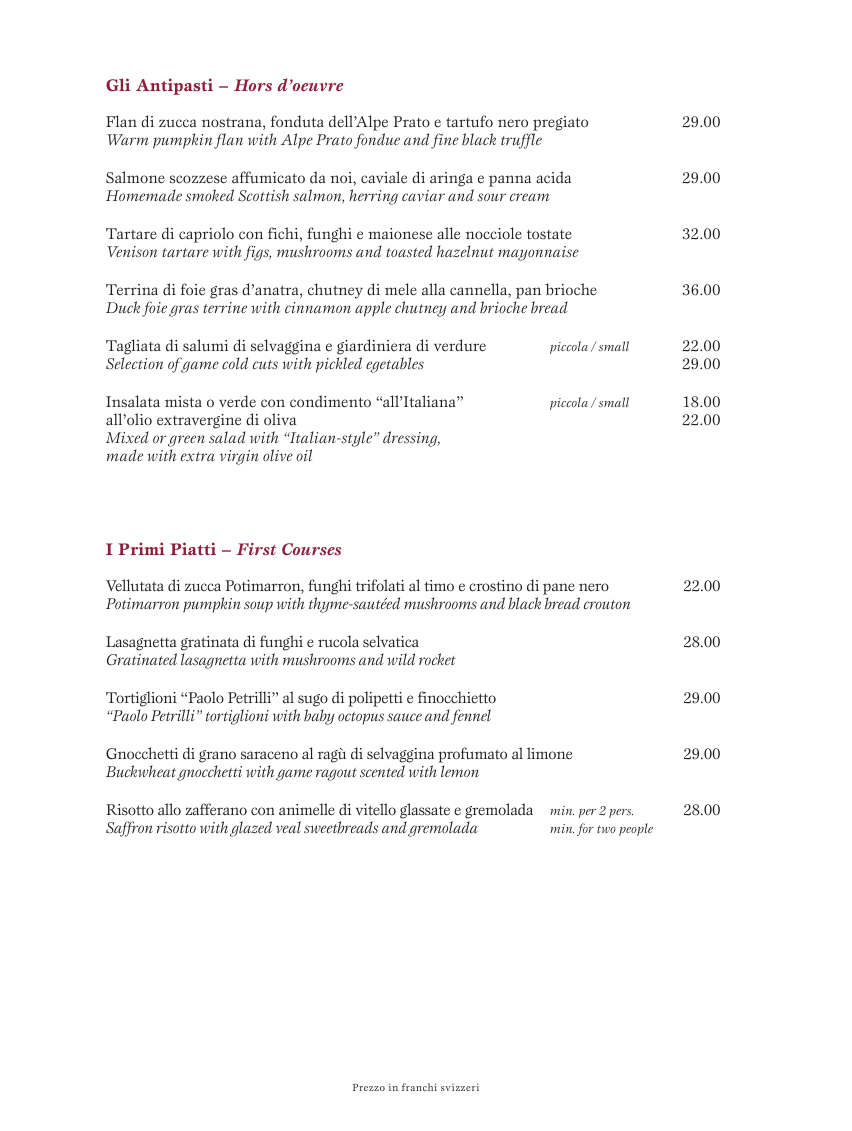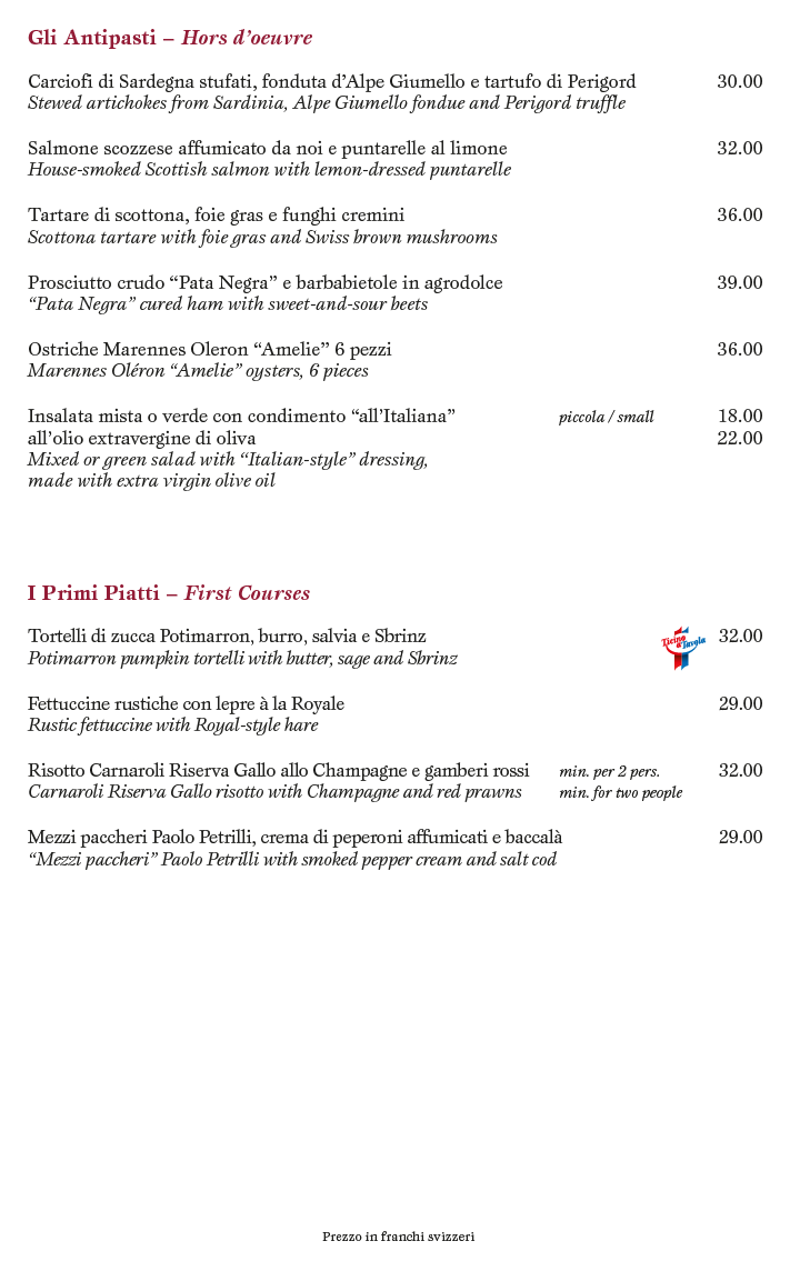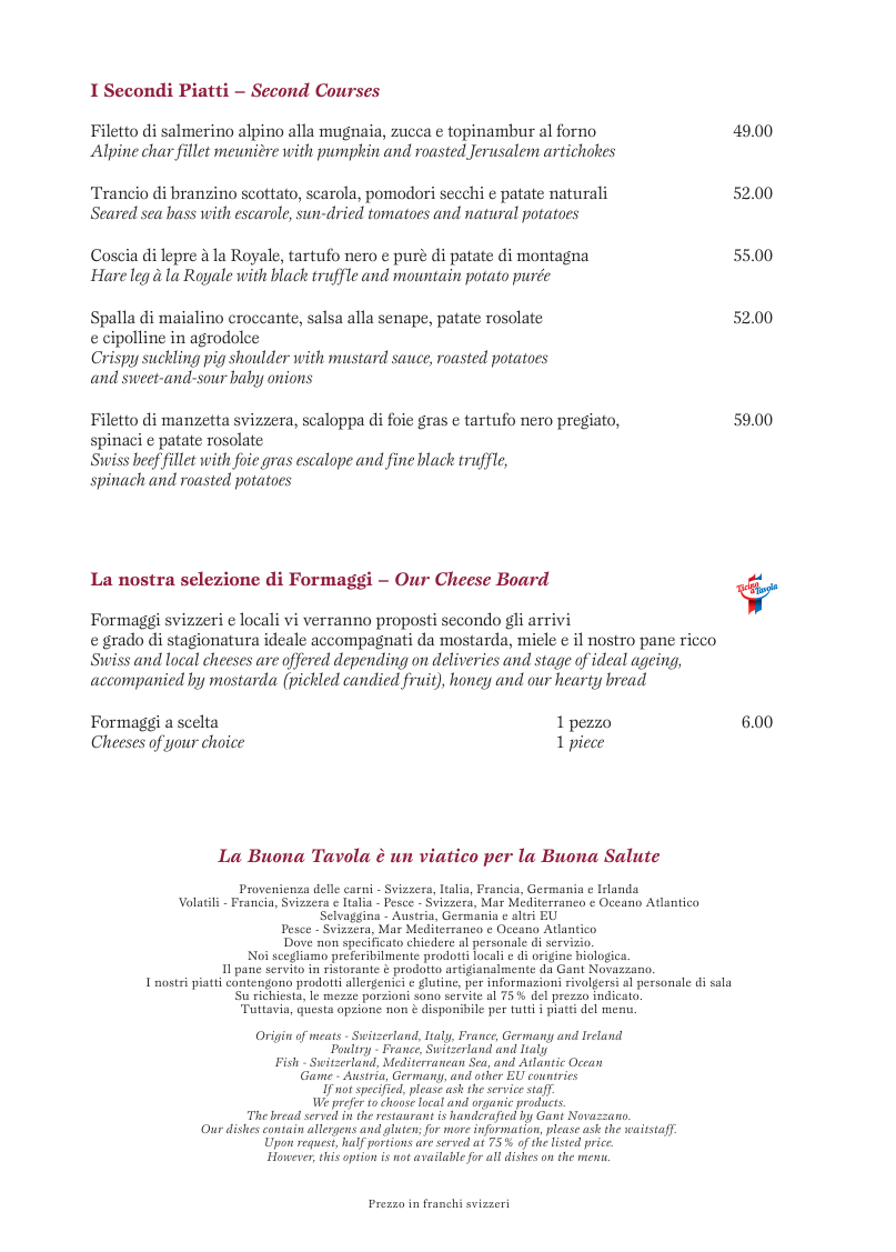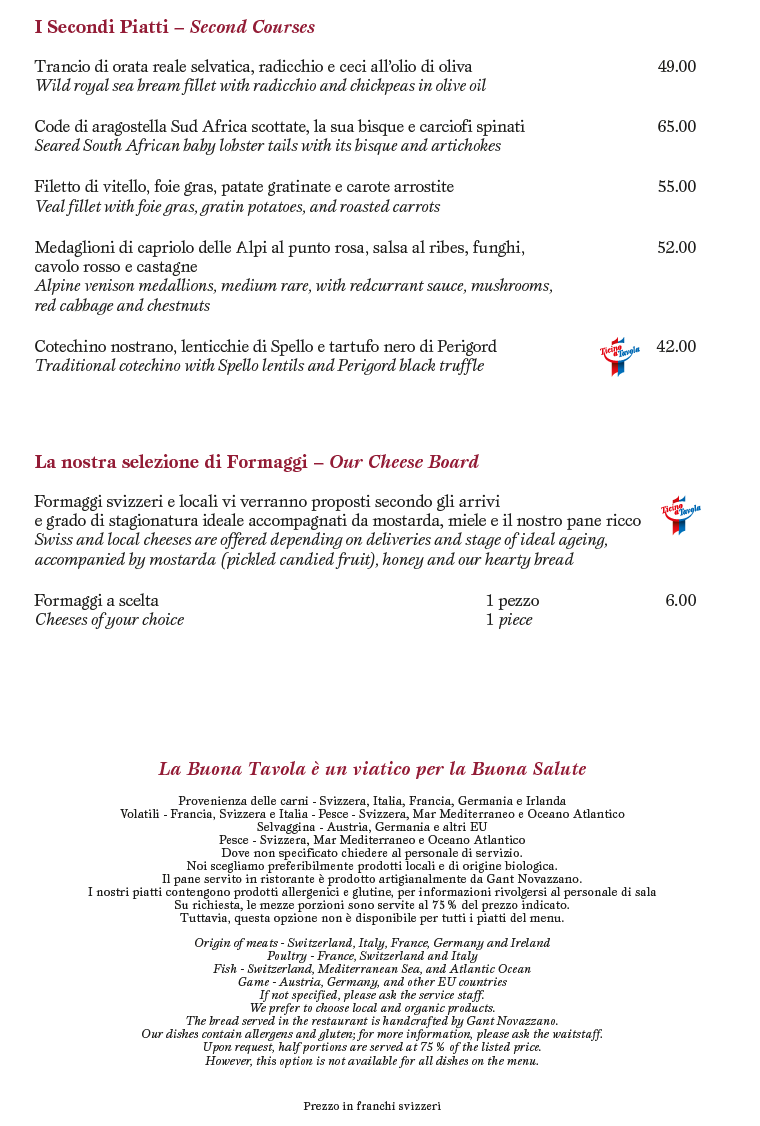Provenienza delle carni: Svizzera; pollame: Francia, Svizzera, Italia; selvaggina: Austria, salvo diversa indicazione. Diamo priorità alla cucina con prodotti locali, freschi e biologici.