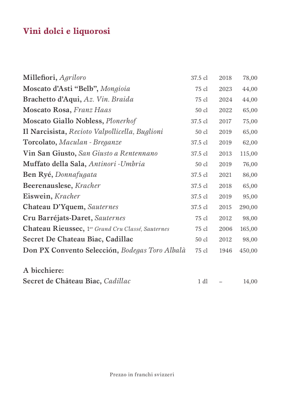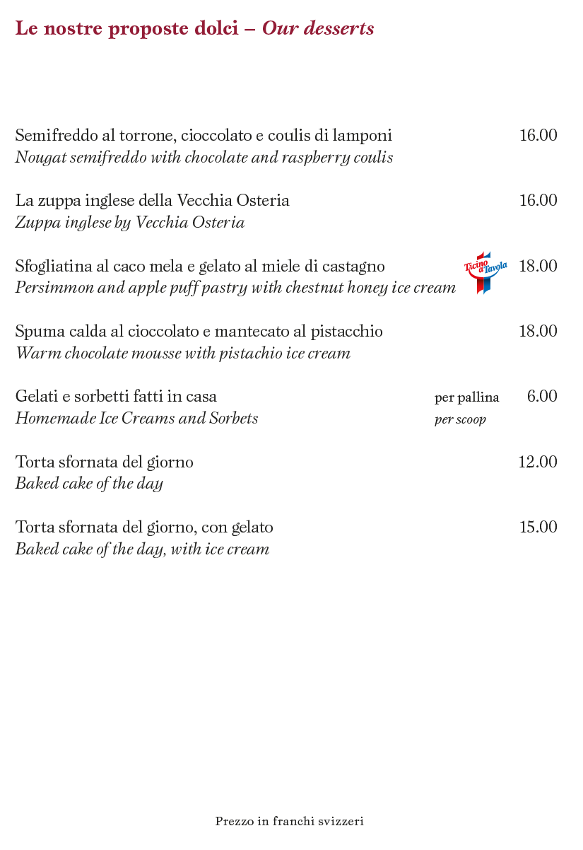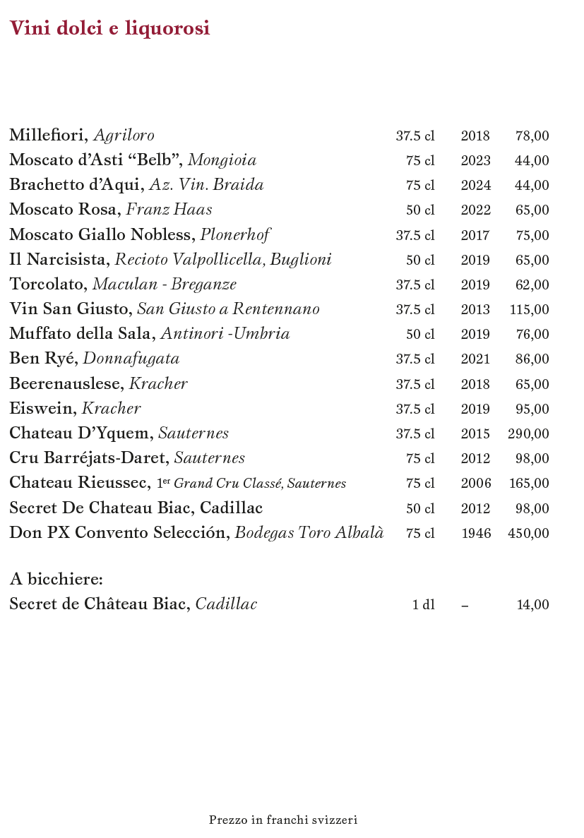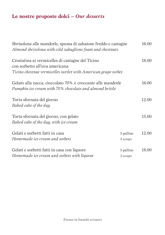 Provenienza delle carni: Svizzera; pollame: Francia, Svizzera, Italia; selvaggina: Austria, salvo diversa indicazione. Diamo priorità alla cucina con prodotti locali, freschi e biologici.